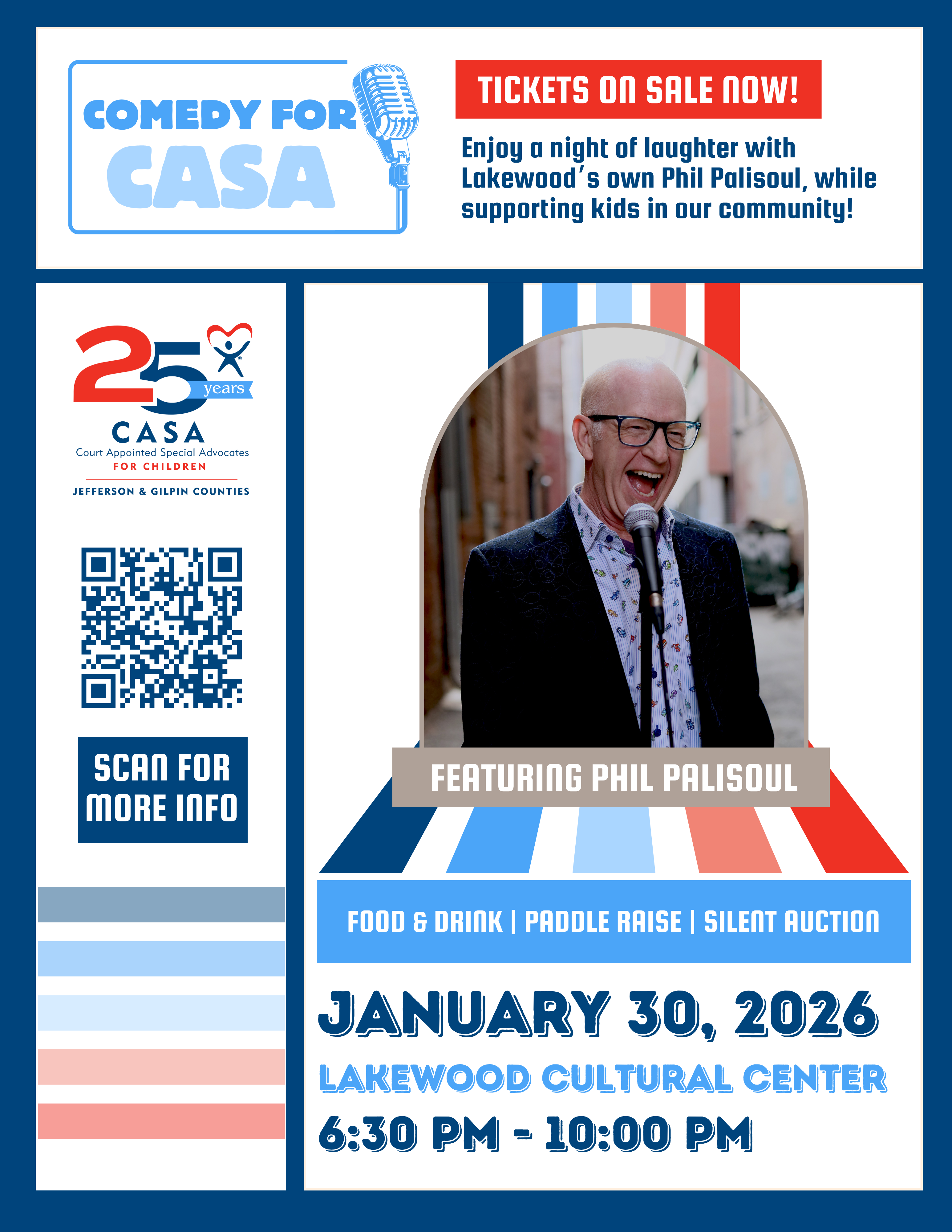 Join CASA Jeffco/Gilpin for an unforgettable evening of laughter and giving back! On Friday, January 30, 2026, we’re thrilled to host Comedy for CASA, an exciting fundraising event that promises fun and entertainment for a great cause.
